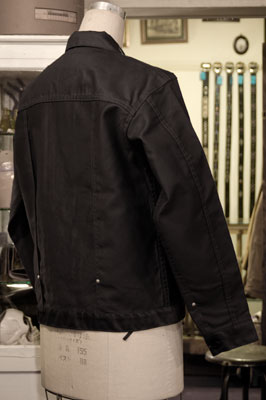 写真では伝わりにくいと思いますが、少し艶のある黒の厚めのコットンサテンで作る事で、武骨さの中にも品があるジャケットに仕上がりました。
