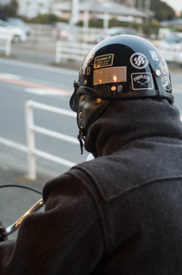 フードを被り、チンストラップを留め、ヘルメットを被れば、