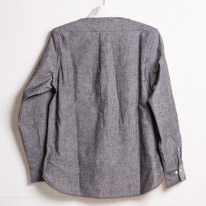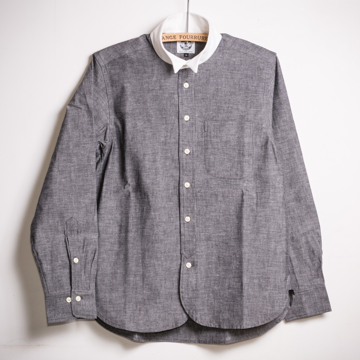 元来格式高いウイングカラーシャツを、単純に格好良いと思い、普段使いもして頂きたく、素材をシャンブレー、スティフブザム、比翼仕様も削除して仕上げました。もちろんある程度のフォーマルシーンにも対応しますが、ここでは伝統を知った上で、敢えて遊んで…