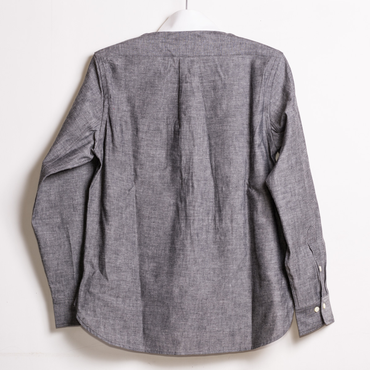 歴史と格式を持つウイングカラーのシャツを、ローンやブロードで仕上げても面白味が少ないので、品の良さが残る、タフなシャンブレーを選びました。