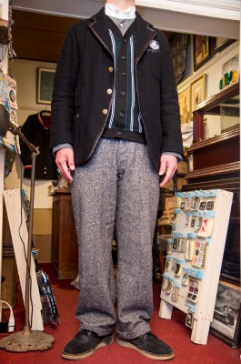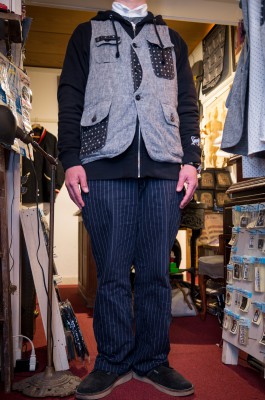 そこでフォーマルなウイングカラーにサスペンダー、やや太めのチョークストライプのパンツ。ここまではかなりドレス寄りですが、そこに完全にカジュアルなスウェットパーカ、そして、元々はジャケットの上に羽織る事が目的のハンティングベストで、ややオーセンティックな雰囲気を追加してみました。