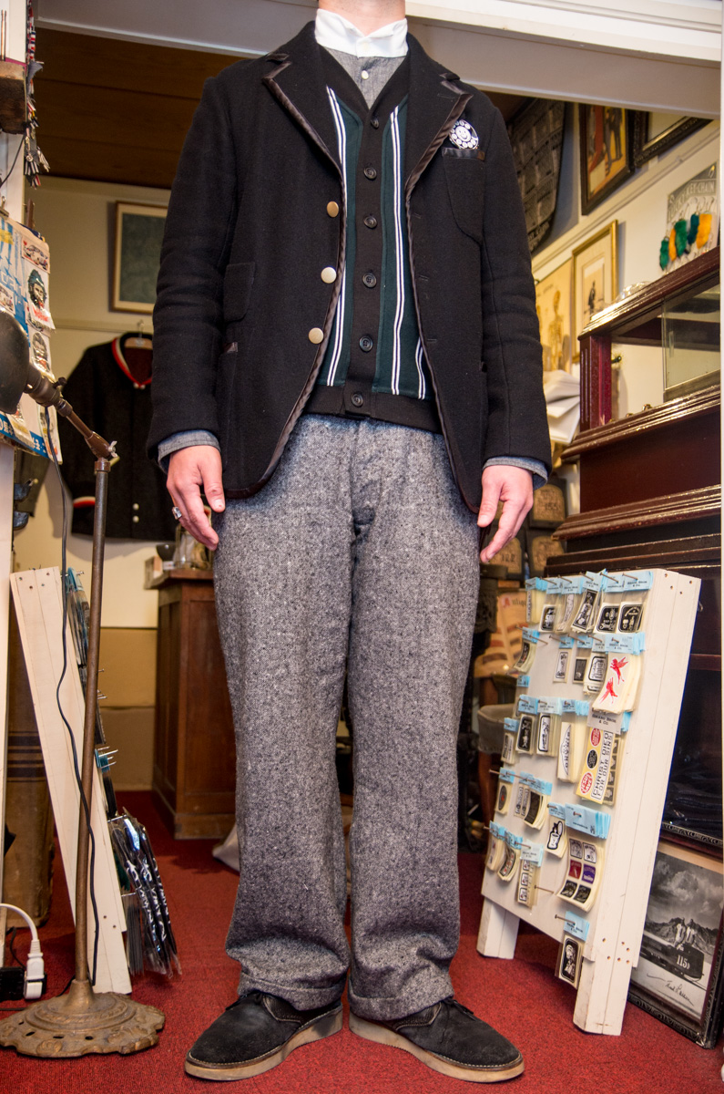 ノータイにニットベスト、元々スポーツウェアのブレザー、そして足元はカジュアルダウン。パンツのみややドレッシーなスラックスをサスペンダーで吊り、写真には写っていませんが、ヘッドウェアはパンツと同素材のゴルフキャップ。