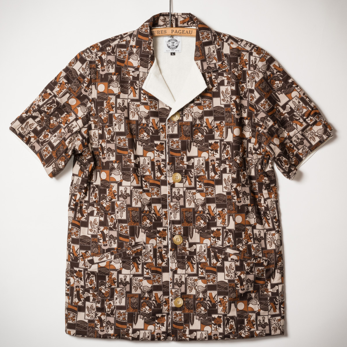 往年のマフィアのリゾート着の様でもあり、戦後横浜の不良の様でもある、アダルトでリラックスしたムードが漂うビーチシャツとショーツです。
