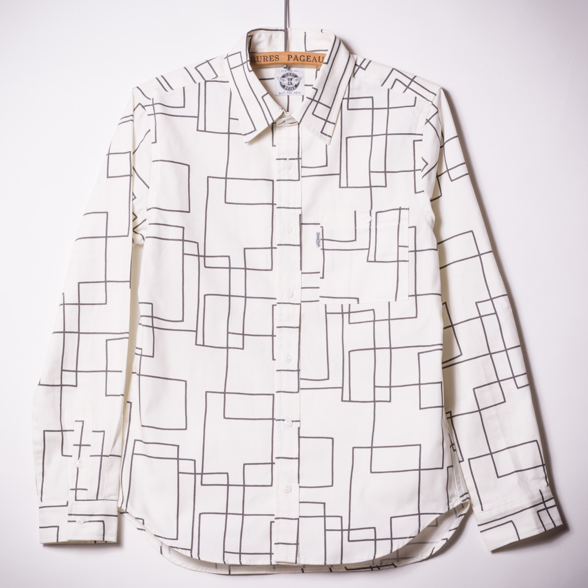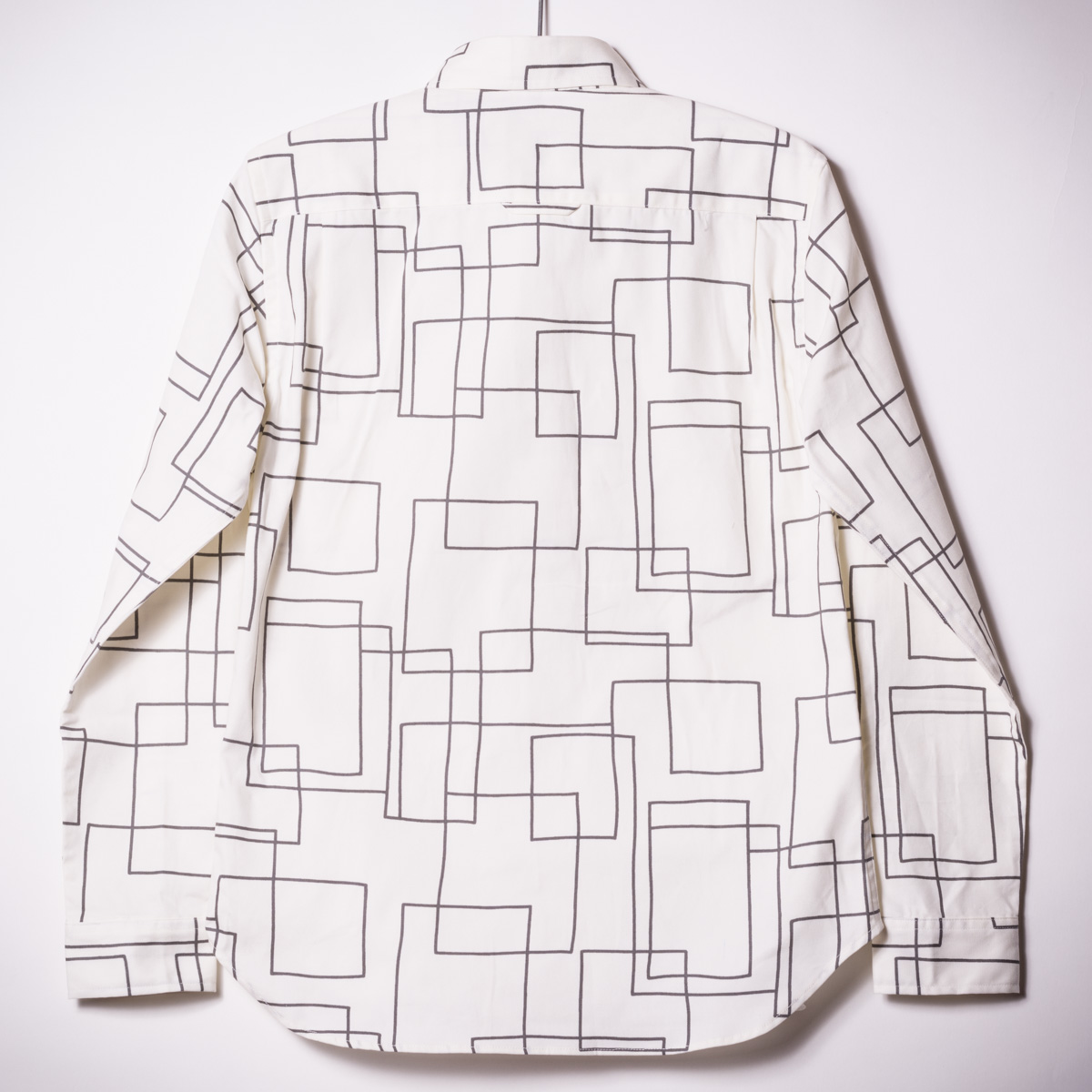 スタンダードな形と、ホワイトのボディにチャコールグレーの模様が独特の落ち着きを持つ、大人のカジュアルシャツです。