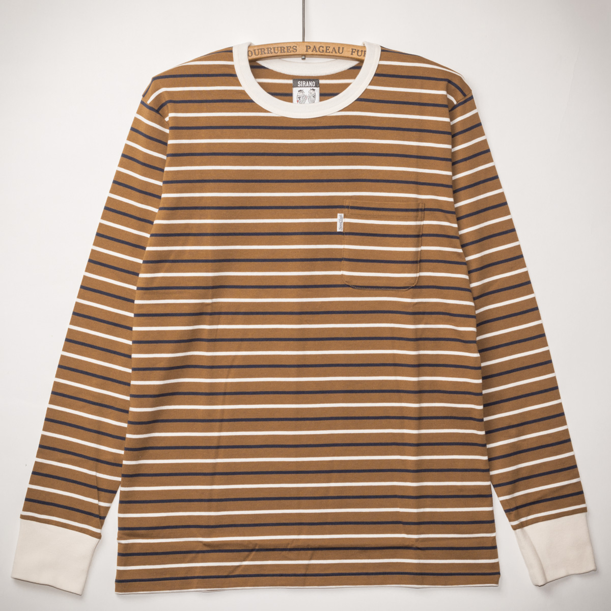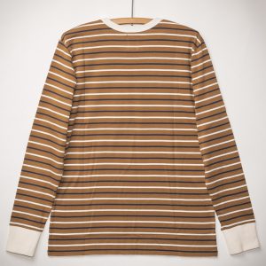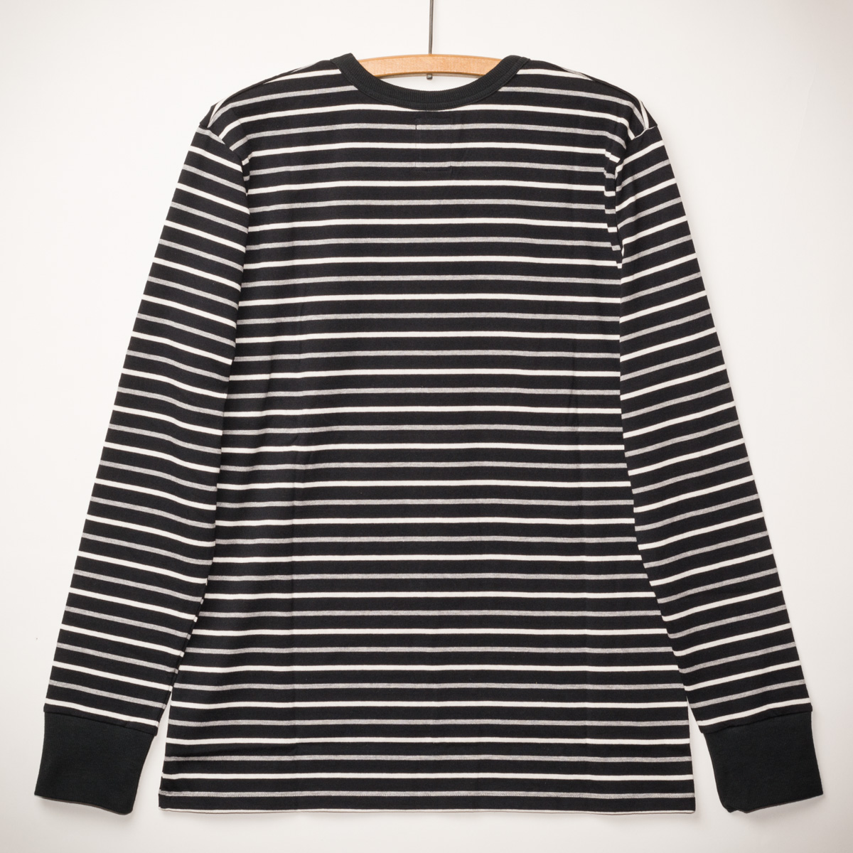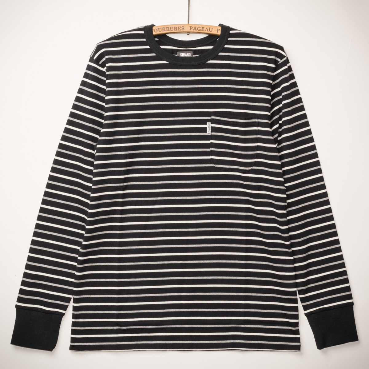 ブラックにホワイトとグレー、あるいは、イミテーションゴールドにアイボリーとネイビーのストライプが落ち着きを持った、大人のカットソーです。