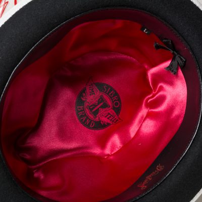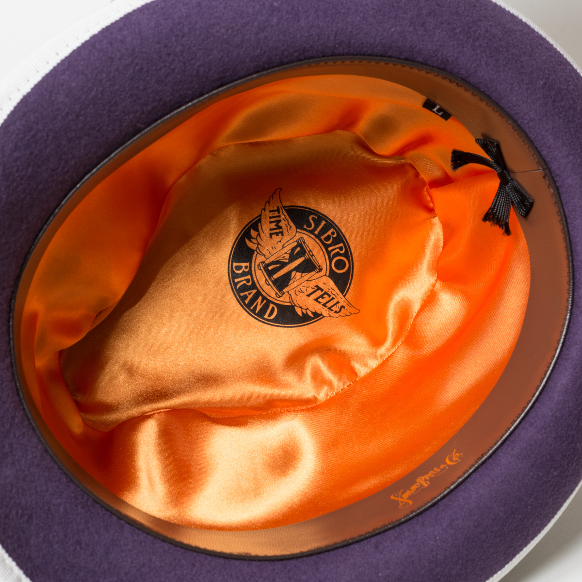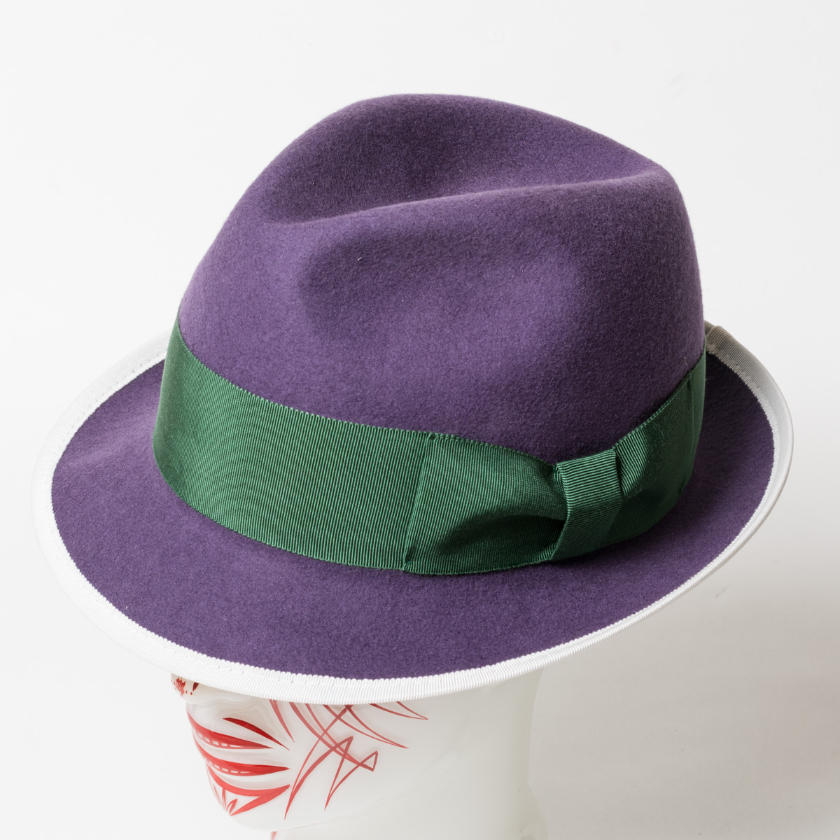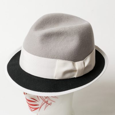 カラー自体はモノトーンのスタンダードなカラーですが、ブラック・グレーのツートンの帽体にホワイトリボンを使用する事で、落ち着いたカラーリングにもかかわらず、適度な存在感を示すハットに仕上がりました。