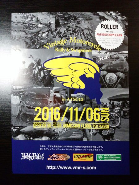 11/6に厚木で開催される「Vintage Motorcycle Rally & Swapmeet」に、今年も出店させて頂きます。屋外のイベントということもあり、私共の新品商品ではなく、ビンテージ古着や私共商品の古着を販売する予定です。当日は実店舗も通常通り営業しておりますので、併せて宜しくお願い申し上げます。